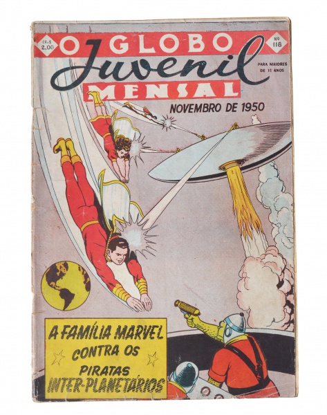 • Revista em Quadrinhos - HQ: "O GLOBO JUVENIL MENSAL" - nº 118, datada de novembro de 1950. Capa: A Família Marvel contra os Piratas Inter-Planetários. Rara revista, com quadrinhos da Família Marvel, Aventuras de Artur, Capitão Marvel, etc.. Bem conservada.