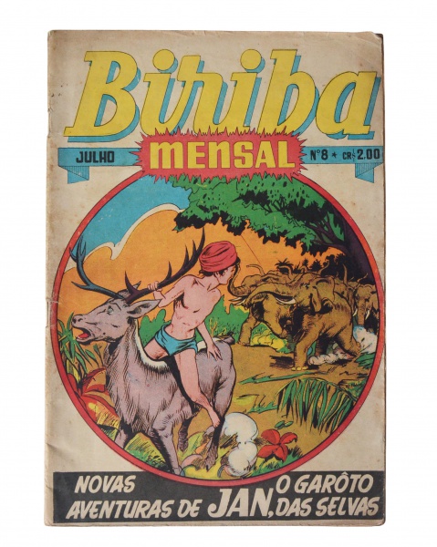 • Revista em Quadrinhos - HQ: "Biriba Mensal" - nº 8, datada de julho de 1950. Capa: "Novas Aventuras de Jan, o Garôto das Selvas". Rara revista, com quadrinhos de Rigolô, Piratas dos Sete Mares, Tocha Humana, Principe Submarino, Jan das Selvas, etc.. Conservada.