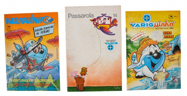 • VARIG - Aviação Civil - Histórias em Quadrinhos e Passatempo (03): "Variguinho", nº 9, datado de abril de 1988, Ícaro Editora, 36 páginas. Pequena perda na capa. Interior em ótimo estado / "Variguinho", nº 29, datado de dezembro de 1993, Ícaro Editora, 38 páginas. / "Passarola", nº 14, circa 1977 - Cinquentenário da Varig , Grafipar Editora, 34 páginas. Alguns passatempos preenchidos à caneta. *** Publicado pela Editora Ícaro, da área de publicidade da Varig. Distribuído nos voos da companhia, tem como protagonista Variguinho e seus amigos, que viajam por todo o Brasil e ensinam um pouco da história da aviação e outras curiosidades sobre o tema. A revista Passarola foi uma publicação de bordo da Varig, voltada para o entretenimento dos passageiros, com passatempos como palavras cruzadas e jogos. Era distribuída aos passageiros nos voos da companhia aérea, especialmente nas décadas de 1970 e 1980.