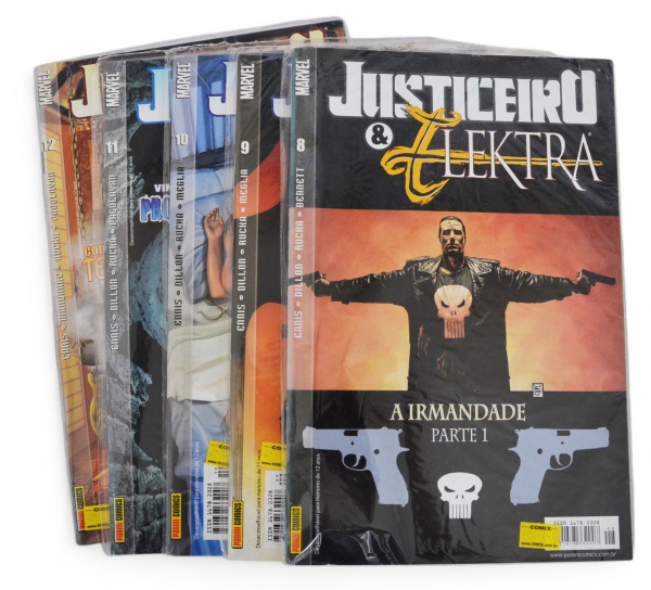 • MARVEL - "JUSTICEIRO & ELEKTRA" - nºs 8 ao12. Editora Panini Comics. Revistas em quadrinhos em perfeito estado de conservação, estando os nºs 9, 10, 11 e 12 ainda no plástico original de fábrica, ou seja, nunca lidas ou manuseadas. Acompanham case para 12 revistas.
